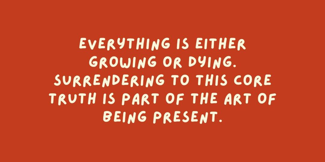 The face of death is not one of decay. It is the rose in the instant it stops growing. Everything is either growing or dying. Surrendering to this core truth is part of the art of being present. A microcosm of this truth can be found in every cell. A macrocosm of this truth can be found in each galaxy. The fact that everything is either growing or dying pertains to societies as well as life forms. Contemplating death offers peace in the moment these truths are perceived.