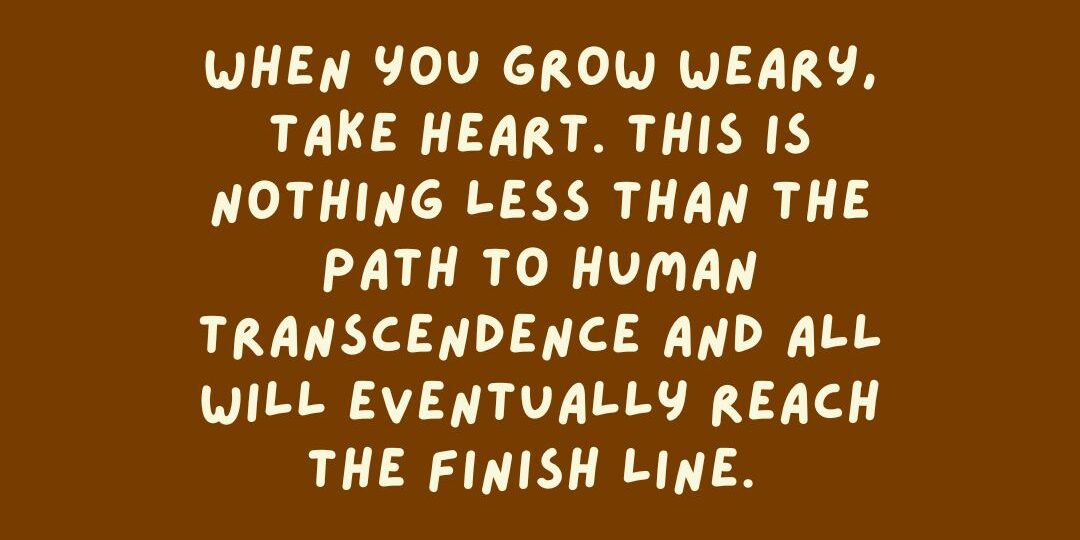 This is the journey to soul-love. It requires great courage to choose this path. But there will be helpers along the way. When you stumble, look for the hands that are reaching out to help you rise. And offer a hand to others who stumble along their own path. When you grow weary, take heart. This is nothing less than the path to human transcendence and all will eventually reach the finish line.