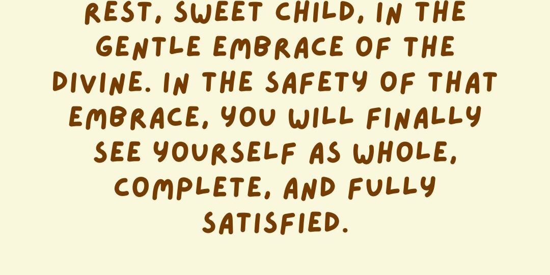 Surrender to my love. Rest, sweet child, in the tenderness of my embrace. In the safety of my arms, you will finally see yourself as whole, complete, and fully satisfied. Right now, in this moment, you have access to the fullness of your perfection, the recognition of your divine beauty in human form. And you are so beautiful to me, precious child. Your sweet spirit is so willing to embark on new adventures in this beautiful life you’ve been given.