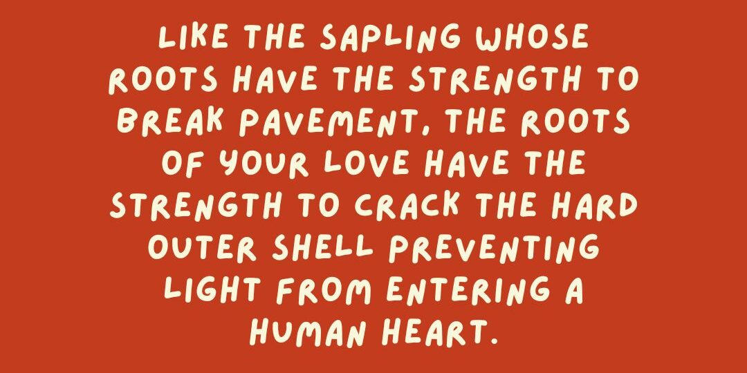 Like the sapling whose roots have the strength to break pavement, the roots of your love have the strength to crack the hard outer shell preventing light from entering a human heart. As a great opener of hearts, you are being called now to take center stage. And we will be watching with elation as you give the performance of a lifetime!